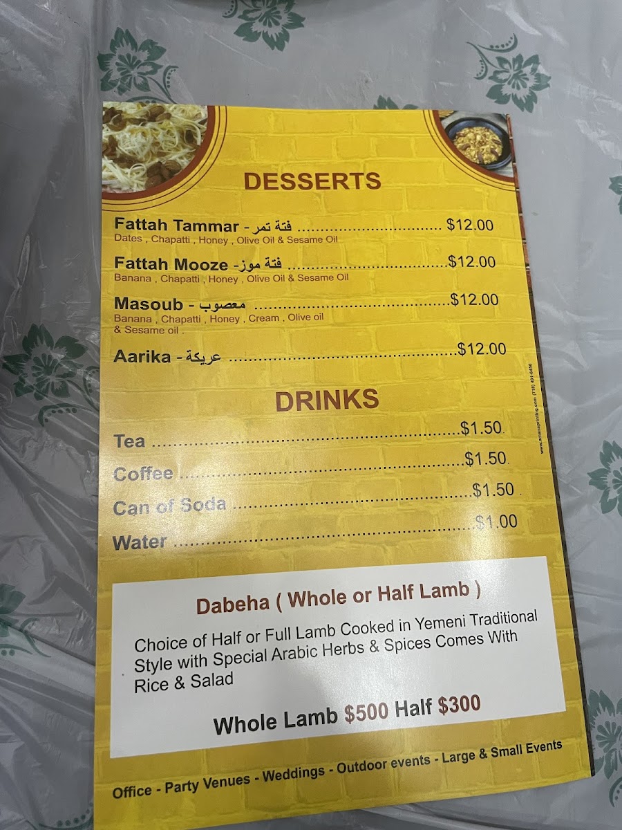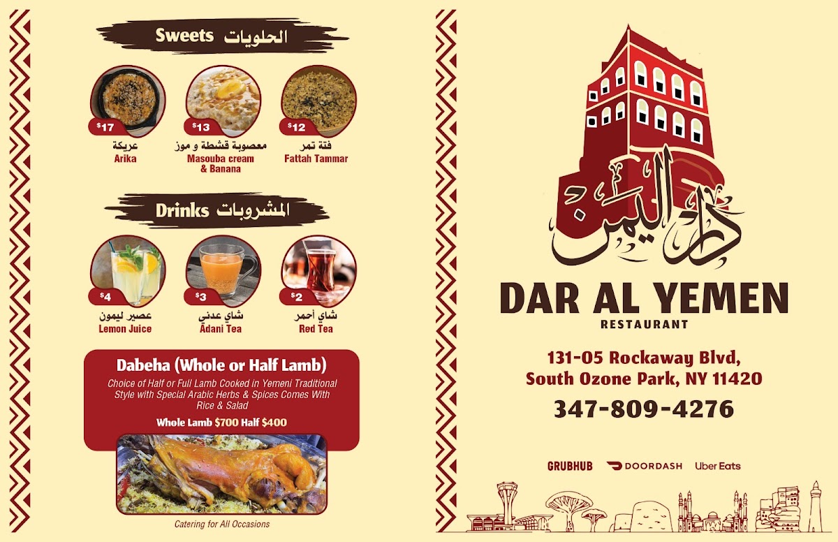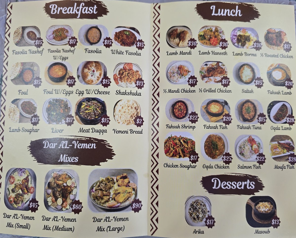 Dar Al Yemen offers a menu that reflects authentic Yemeni home cooking with a focus on hearty, comforting dishes. The menu is straightforward and inviting, making it easy to find a satisfying meal whether you’re stopping by for a casual lunch or a relaxed dinner.
